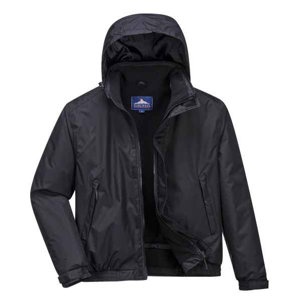 This top quality bomber jacket provides excellent protection against wet and windy conditions. It is completely waterproof windproof and breathable. Fleece lining and padded sleeves provide optimum warmth and comfort to the wearer. The style has a clever pack away hood zipped lower pockets and hook and loop adjustable cuffs.