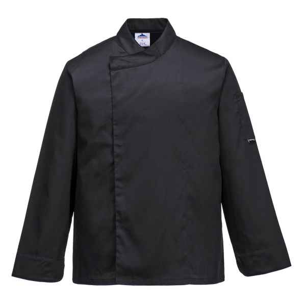 This jacket provides the sturdiness and durability of polycotton fabric with an updated design. The cross over collar and concealed stud fastening give this jacket a modern and sleek appearance. Features include a handy sleeve pocket cuff vents and MeshAir aerated mesh underarms to improve airflow.