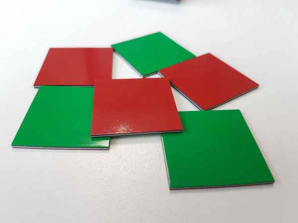 Double-sided thin square magnets. Red on one side, Green on the other. Use it for status on your boards. With these, you don’t need to park green magnets while using red magnets, and vice versa.