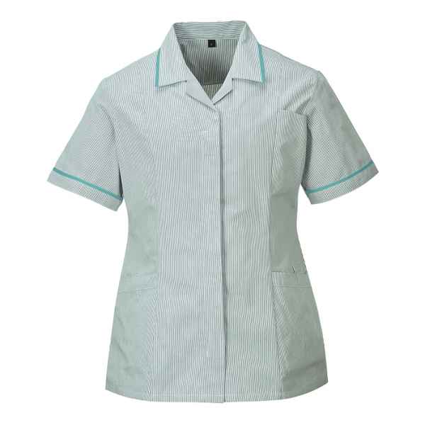 Made from high quality woven stripe fabric this tunic is stylish yet extremely comfortable. The action back provides freedom of movement while the darts give the garment a flattering fit. Ideal for embroidery and as part of a uniform the neutral colours make this garment the perfect choice for a variety of work places.