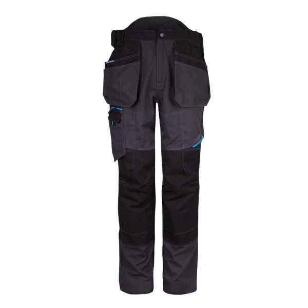 Contemporary work trouser featuring clever holster pockets for ample storage and security. Made from durable poly-cotton canvas fabric and includes triple stitched seams these trousers have a multitude of practical features including two-tier knee pad pockets a high rise back waistband and an adjustable leg hem for added convenience. Innovative stretch panelling provides excellent comfort and flexibility in key movement areas.